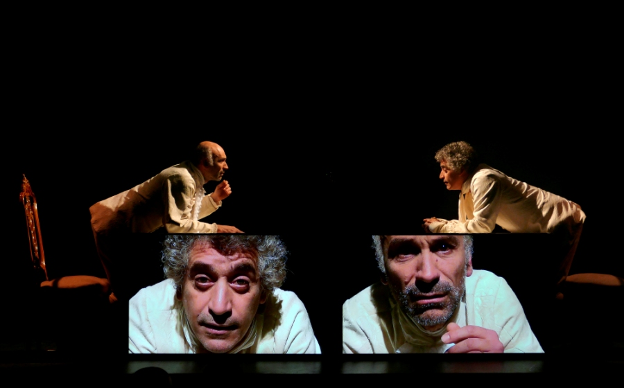 Trobo que posar les pantalles laterals on veiem els primer plànols dels actors no és una bona idea. No ho és per dues raons: la primera és que a l’actor Álex Peña no me’l crec en cap moment. No veig en ell a Mozart, sinó a un home mal assegut en la cadira d’una taberna, rient-se de tot, com si res l’importés. Els seus gestos no ajuden a pensar en Mozart, sobretot perquè aquesta actitud una mica passota del personatge sembla contradictòria amb el que la tradició ens ha mostrat del compositor. Per altra banda, Javier Castro, Salieri, exagera massa la gestualitat facial. Al principi ens sedueix ràpidament amb la seva tasca, però a mesura que passen els minuts, es va caient en l’abús. Es nota que Castro s’ha inspirat molt en la interpretació de Fahrid Murray Abraham a l’Amadeus de Milos Forman i segurament la idea de les pantalles és deutora dels primers plànols que Forman fa de Salieri a la pel·lícula. Ara bé, una cosa són uns primers plànols puntuals en un film de gairebé tres hores i una altra són seixanta minuts mirant un primer plànol. El problema és que Castro vol donar-ho tot en la gestualitat facial, vol lluir-se, i hi ha moments en què posa cares més aviat ridícules. A més, el gran esforç de Castro contrasta amb el passotisme del personatge que interpreta Peña. El desequilibri interpretatiu és clar.