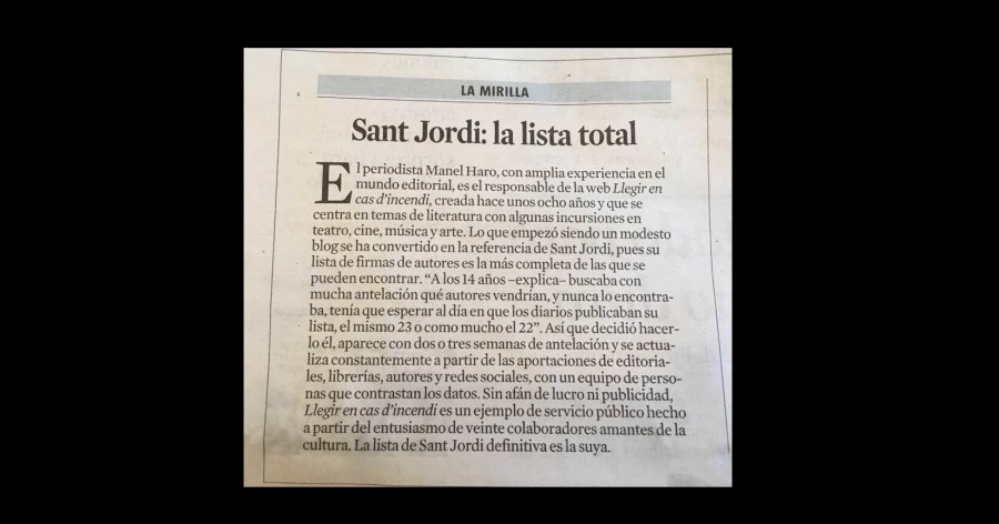 Des de Llegir en cas d’incendi ens sentim tots molt emocionats d’aquestes paraules que apareixen a La Vanguardia, del dia 22 d’abril de 2017, a la pàgina 2 del diari, just després de la portada. L’equip que formem Llegir en cas d’incendi seguirem treballant amb passió per compartir amb tots vosaltres les nostres inquietuds. Gràcies a tots per llegir-nos!