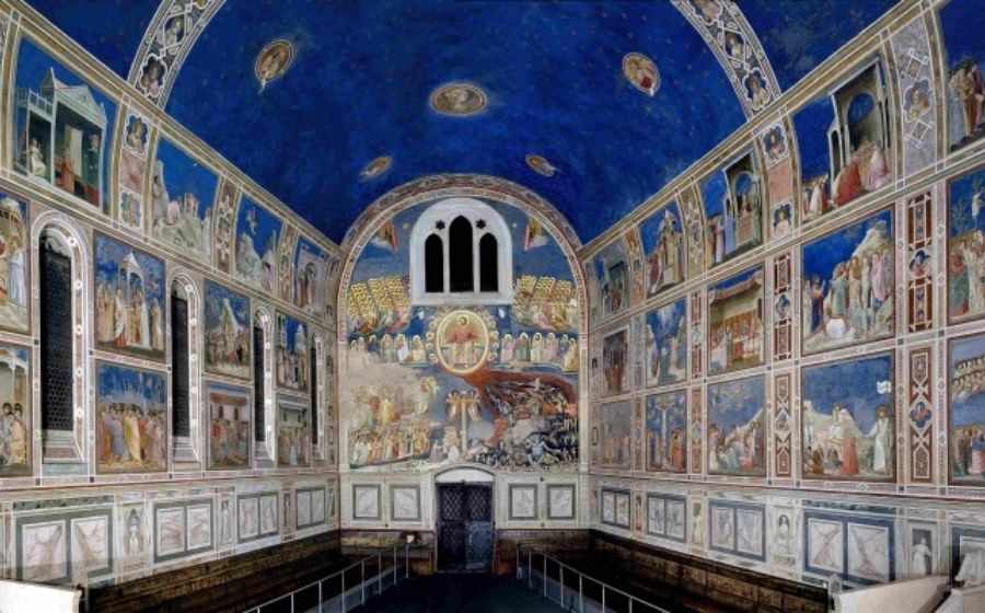 Aquesta capella data de principis del segle XIV i va ser encarregada pel financer Enrico Scrovegni per tal d’expiar els pecats del seu pare, l’usurer Reginaldo, qui apareix a l’Infern de la Divina Comèdia de Dante. Aquest petit temple estava situat al costat del palau familiar, avui desaparegut, i sembla ser que la idea dels frescos de Giotto estava ja plantejada en la fase inicial de la concepció de la capella, així que no es descarta que el pintor hagués intervingut en la fase de definició del projecte arquitectònic, d’una gran senzillesa, per altra banda. Els frescos de la capella, una de les obres més importants del pintor florentí, contenen diversos episodis de la història sagrada (provinents de diverses fonts, encara que la més important és el Nou Testament), exposats de forma narrativa, el fil de la qual es pot seguir d’esquerra a dreta. Les pintures estan disposades en tres fileres horitzontals de quadres per cadascuna de les dues parets laterals, contingudes per l’absis (on es pot veure una Anunciació i en l’interior hi ha el fèretre d’Enrico Scrovegni) i pel mur oposat (on es pot veure una impressionant escena del Judici Final).