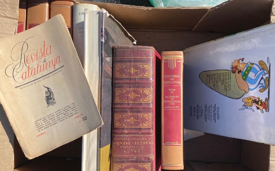 Més enllà, veig postals i una bona col·lecció de vells llibres d’oracions folrats amb tapes de pell, mida de butxaca i publicats a Barcelona, tots ells farcits d’estampetes i recordatoris de difunts. També exemplars de la Revista de Catalunya dels anys trenta amb un conte de Mercè Rodoreda, versos de Carles Riba i articles de Rovira i Virgili, Maurici Serrahima, Ferran Soldevila i Lluís Nicolau d’Olwer, entre altres. A prop, un marc de grans dimensions amb una reproducció en paper del quadre La petita i el bon companyó de Francesc Gimeno al peu de la qual hi ha l’emblema de la Generalitat de Catalunya i el nom del Departament de Cultura i Mitjans de Comunicació. En quina paret estava penjada aquesta reproducció? De qui era la col·lecció de números de la Revista de Catalunya? I els pins dels jugadors del Barça que es van vendre amb el diari Sport els anys noranta? Hi veig Bakero, Begiristain, Salinas, Amor, Sergi Barjuan, Romario, Guardiola, Ferrer, Goikioetxea, Laudrup i Eusebio. Petites coses totes elles disperses, sense connexió les unes amb les altres, però que a la venda d’aquella manera semblen compartir una història i una memòria.