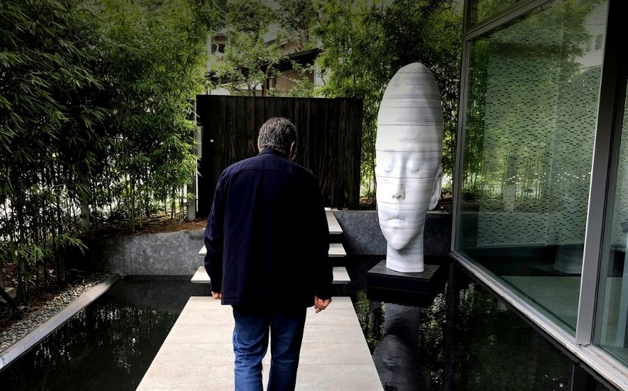 Jaume Plensa (Barcelona, 1955) és un dels artistes catalans més reconeguts internacionalment. Les seves obres han passat per ciutats com Madrid, Barcelona, Estocolm, Göteborg, Chicago, Ogijima (Japó), Tokio i Nova York, entre d’altres. Sense anar més lluny, a la capital catalana, a tocar del Palau de la Música, hi ha una de les seves peces, Carmela, una escultura de ferro fos de 4,5 metres d’alçada. L’art de Plensa és fàcilment reconeixible, convida a l’observació, la reflexió i el silenci. L’espai públic és un dels museus naturals on les seves escultures cobren més sentit, prova d’això és l’impacte que va crear el 2019 la seva obra Darrere dels murs, que la fira d’art contemporani Frieze va ubicar al Rockefeller Center, en plena Cinquena Avinguda de Manhattan. Els ciutadans de Nova York es trobaven, de sobte, amb aquella monumental escultura blanca de més de set metres d’alçada, que representa el cap d’una dona tapant-se els ulls amb les mans. És a dir, enmig del brogit de la ciutat -i no d’una ciutat qualsevol- un element fins llavors desconegut en aquell espai estimulava a aturar-se i a pensar quina mena de diàleg volia establir amb l’espai i el públic que se la trobava.