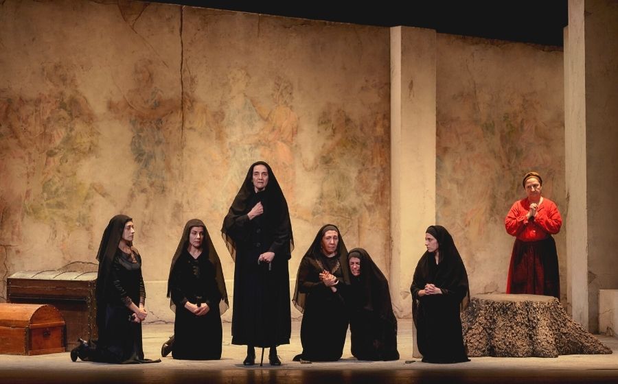 Al Teatre Apolo de Barcelona es pot veure la versió que dirigeix José Carlos Plaza de La casa de Bernarda Alba. En els primers minuts, després de parlar la serventa (interpretada per Rosario Pardo), entra Bernarda Alba (Consuelo Trujillo) i les seves filles. Van de negre, ja que vénen d’enterrar el pare, amb un mocador que tapa completament les seves cares. Bernarda, a més, va amb un bastó. Totes elles s’apropen al públic, amb un pas decidit, lúgubre, com si elles mateixes encarnessin la mort, la part més fosca del ser humà. Aquesta imatge, que dura uns pocs segons, aconsegueix fer-nos entendre molt ràpidament quina és la sensació de por i angoixa que es viu entre les parets d’aquella casa. Sembla un detall sense importància, però és una autèntica genialitat, tan genial que només per això ja voldria tornar al Teatre Apolo a veure una altra funció.