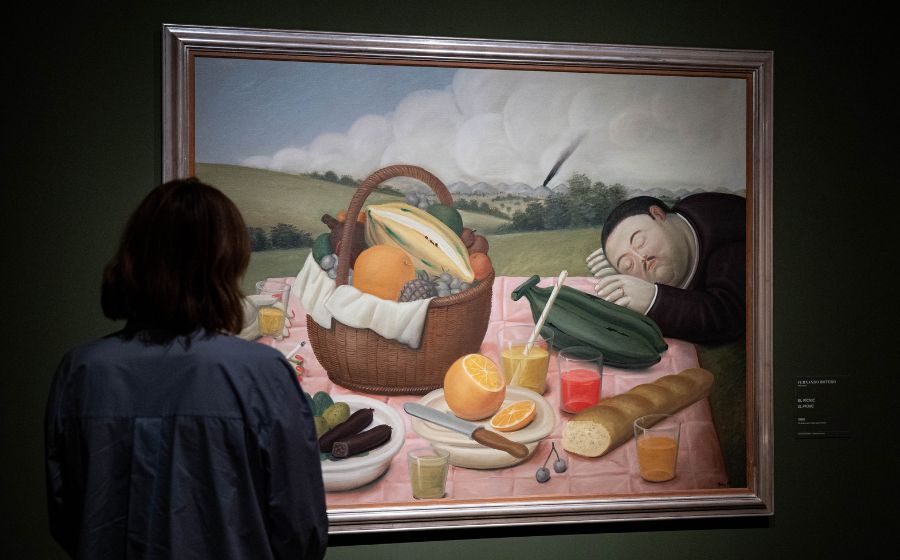 Altres seccions de l’exposició són Amèrica Llatina (on veiem l’exuberància de la natura i la força dels colors en escenes quotidianes, però enigmàtiques), el món del circ, la religió, les natures mortes o, fins i tot, una reinterpretació de grans clàssics de la pintura que mostren la seva admiració per artistes com Velázquez, Ingres, Vigée Lebrun o Da Vinci. Val la pena aturar-se per exemple en la versió -exuberant, és clar- que Botero fa d’El matrimoni Arnolfini, de Van Eyck, o davant d’una altra obra capital de la història de l’art, el Díptic dels Ducs d’Urbino de Piero della Francesca. L’homenatge a Velázquez es concreta en una peça mai exposada abans, La Menina.