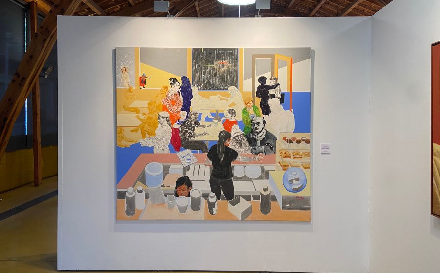 Només començar el recorregut, veiem un quadre de Francesc Artigau (Barcelona, 1940) que podria ser interpretat com una explosió de vida. Es titula Diumenge al matí al SandwiChez (2016). És una tècnica mixta sobre tela molt acolorida, amb personatges que fan la seva en un dels locals d’aquesta coneguda cadena de cafeteries barcelonina. Si hi fixem la mirada, però, veiem que algunes persones són en blanc o negre, d’altres en una escala de grisos. També hi trobem personatges que en principi no haurien d’encaixar en el context de l’escena, com una geisha, però que conformen un ric univers de referències culturals.